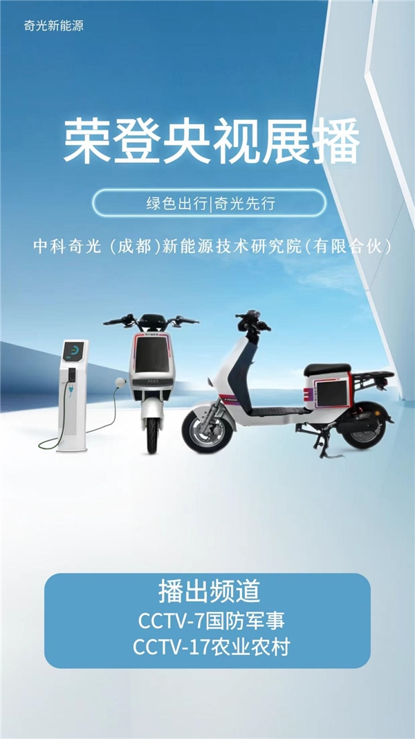 近日,中科奇光(成都)新能源技術(shù)研究院旗下品牌奇光新能源光伏發(fā)電電動車榮登中央廣播電視總臺CCTV-7、CCTV-17頻道進(jìn)行廣告展播,向大眾介紹講述產(chǎn)品故事,以提升國產(chǎn)品牌在公眾心中的影響力,打造優(yōu)選國產(chǎn)品質(zhì),實(shí)現(xiàn)品牌價值和促進(jìn)自身發(fā)展。