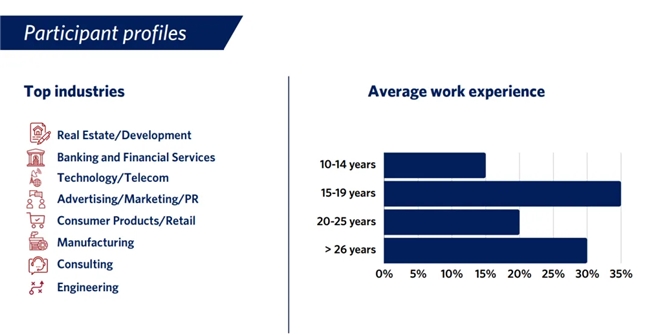 課程自上線(xiàn)以來(lái),已收到來(lái)自美國(guó)、英國(guó)、阿根廷、新加坡等多個(gè)國(guó)家學(xué)員的入學(xué)申請(qǐng)。這些學(xué)員來(lái)自各行各業(yè),包括房地產(chǎn)、金融服務(wù)、技術(shù)、電信、廣告、市場(chǎng)營(yíng)銷(xiāo)、消費(fèi)品、零售、制造、咨詢(xún)和工程等關(guān)鍵領(lǐng)域,并且大多都擁有15-19年工作經(jīng)驗(yàn)。
