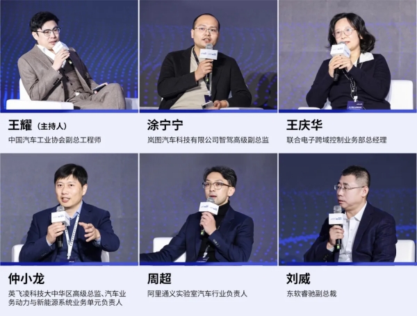 圓桌討論環(huán)節(jié),中國(guó)汽車工業(yè)協(xié)會(huì)副總工程師王耀,嵐圖汽車科技有限公司智駕高級(jí)副總監(jiān)涂寧寧,聯(lián)合電子跨域控制業(yè)務(wù)部總經(jīng)理王慶華,英飛凌科技大中華區(qū)高級(jí)總監(jiān)、汽車業(yè)務(wù)動(dòng)力與新能源系統(tǒng)業(yè)務(wù)單元負(fù)責(zé)人仲小龍,阿里通義實(shí)驗(yàn)室汽車行業(yè)負(fù)責(zé)人周超,東軟睿馳副總裁劉威共同圍繞“AIDV時(shí)代下,汽車軟件的生態(tài)融合與創(chuàng)新突破”主題進(jìn)行討論,探討AI定義汽車的未來(lái)趨勢(shì),并結(jié)合實(shí)際案例提出生態(tài)融合的創(chuàng)新路徑,為AIDV 時(shí)代生態(tài)協(xié)同發(fā)展提供多元思路與深刻見(jiàn)解。