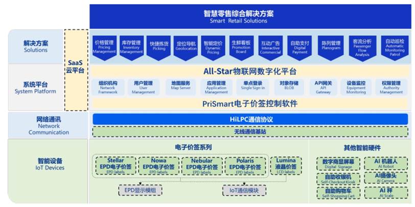 圍繞零售門店數(shù)字化領(lǐng)域,漢朔科技構(gòu)建了以電子價(jià)簽系統(tǒng)、SaaS云平臺(tái)服務(wù)等軟硬件產(chǎn)品及服務(wù)為核心的業(yè)務(wù)體系,面向零售行業(yè)客戶提供電子價(jià)簽系統(tǒng)等軟硬件一體化解決方案。