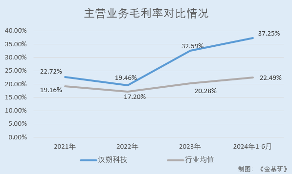 2021-2023年及2024年1-6月,漢朔科技的主營(yíng)業(yè)務(wù)毛利率分別為22.72%、19.46%、32.59%、37.25%,高于行業(yè)均值。
