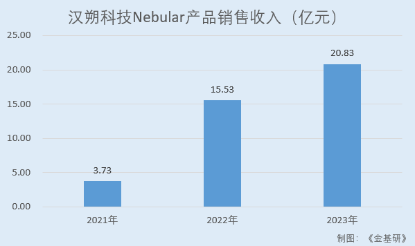 2020年,漢朔科技成功推出的新一代電子價(jià)簽Nebular獲得市場(chǎng)客戶的廣泛認(rèn)可。2020-2023 年,漢朔科技Nebular產(chǎn)品銷售收入分別為0.10億元、3.73億元、15.53億元、20.83億元,年均復(fù)合增長(zhǎng)率達(dá)到487.21%,占主營(yíng)業(yè)務(wù)收入比例從0.95%增長(zhǎng)至55.18%。