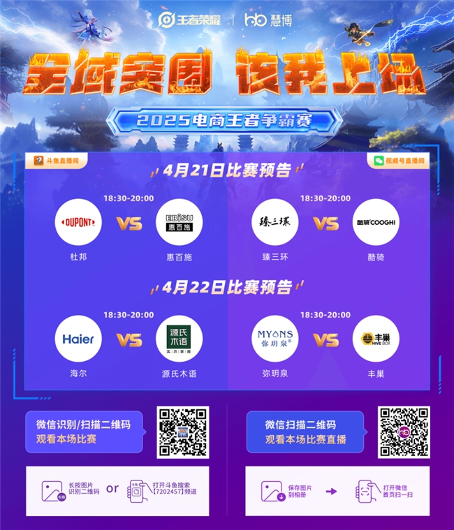賽事將在 “北京慧博科技” 官方視頻號(hào)、斗魚號(hào)同步直播,掃描下方二維碼立即預(yù)約觀賽,精彩對(duì)決不容錯(cuò)過!4 月 21 日 18:30,我們不見不散,共同見證電商王者的誕生!