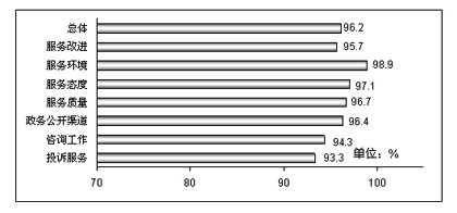 (2)在本次調(diào)查設置的“總體滿意度”、“服務質量”、“服務態(tài)度”、“政務公開渠道”、“咨詢工作”、“投訴服務”、“服務環(huán)境”等多項指標上,公眾滿意度都在九成三以上,呈現(xiàn)出比非政務中心窗口更高的水平,其中,總體滿意度高達96.2%(見下圖);在“服務改進情況”指標上,53.7%的受訪者認為政務中心窗口“有很大改進”,高出非政務中心窗口13.3個百分點。