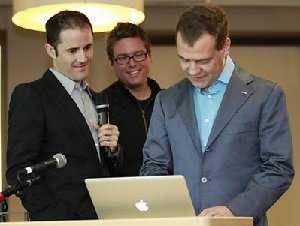 梅德韋杰夫(右一)在兩位Twitter聯(lián)合創(chuàng)始人的幫助下開(kāi)通Twitter賬戶(hù)