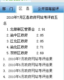 2010年7月,市政府辦公廳對北部新區(qū)政府網(wǎng)站的考核得分為2.91分,列全市區(qū)縣網(wǎng)站考核第一名,這是北部新區(qū)對外網(wǎng)站今年第二次列榜首的位置。