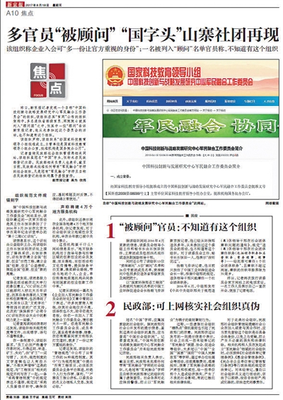 8月18日,新京報刊登報道《多官員“被顧問” “國字頭”山寨社團再現》,曝光一個自稱“中國科技創(chuàng)新與戰(zhàn)略發(fā)展研究中心軍民融合工作委員會”的組織,雖冠名“國字頭”,卻未在民政部登記注冊,一位被列入其“顧問”名單的退休官員表示“不知道有這個組織”。