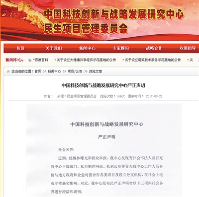 “中國科技創(chuàng)新與戰(zhàn)略發(fā)展研究中心”在其“下屬機構”——民生項目管理委員會網站發(fā)布聲明,否認兩家組織與其所屬關系。
