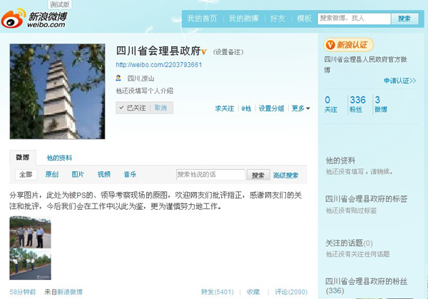 經(jīng)過認(rèn)證的名為“四川省會理縣政府”的微博于18點(diǎn)24分發(fā)布第一條微博,稱“由于我縣工作人員的失誤,在政府網(wǎng)站上發(fā)表了一張PS過的照片,他對于新聞?wù)鎸?shí)性的理解有誤,使得我縣在網(wǎng)絡(luò)上受到了更多的關(guān)注。在此,會理縣政府對于廣大網(wǎng)友的關(guān)注表示理解,并希望對此事道歉,并澄清。”