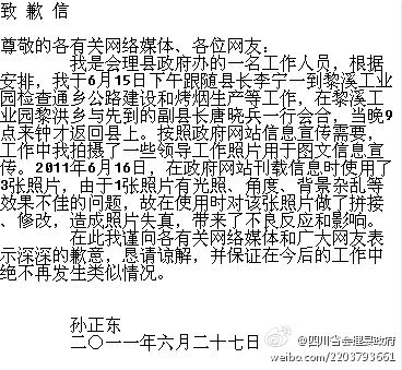 隨后,微博發(fā)布了署名“孫正東”的會理縣政府工作人員的道歉聲明,稱由于“照片光照、角度、背景雜亂等問題,在使用時(shí)對該張照片做了拼接、修改,造成照片失真”,并向媒體和網(wǎng)友道歉。