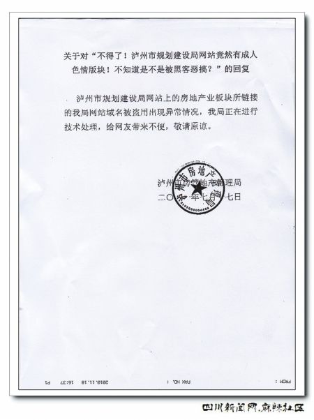 針對此事,記者立即向市住房與規(guī)劃建設(shè)局核實和了解情況。市住房與規(guī)劃建設(shè)局辦公室主任肖友權(quán)向記者表示,17日,部門網(wǎng)站上確實發(fā)生了這樣的事情。事情發(fā)生后,整個部門領(lǐng)導(dǎo)都相當重視,在事態(tài)擴大之前,立即進行了技術(shù)處理,并在第一時間和四川新聞網(wǎng)、瀘州論壇銜接,力求更妥善處理此事。