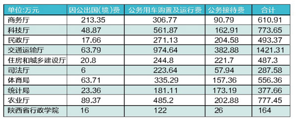 陜西省10部門8月5日公布2010年“三公”支出。其中支出最多的是省交通運(yùn)輸廳,2010年“三公”支出為1421.31萬元;支出最少的是陜西省行政學(xué)院,為164萬元。