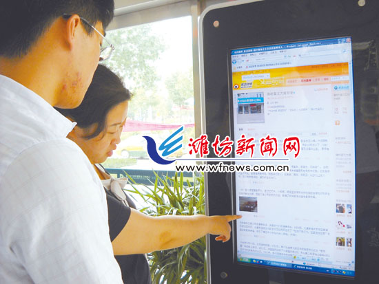 8月17日,上午記者來到奎文區(qū)大虞街道社區(qū)服務大廳,門口左側有臺近兩米高的信息機,走近一看碩大屏幕上顯示的是該街道的微博內容,其中最新的一條信息是奎文區(qū)招聘人力資源和社會保障專管員的招聘簡章。