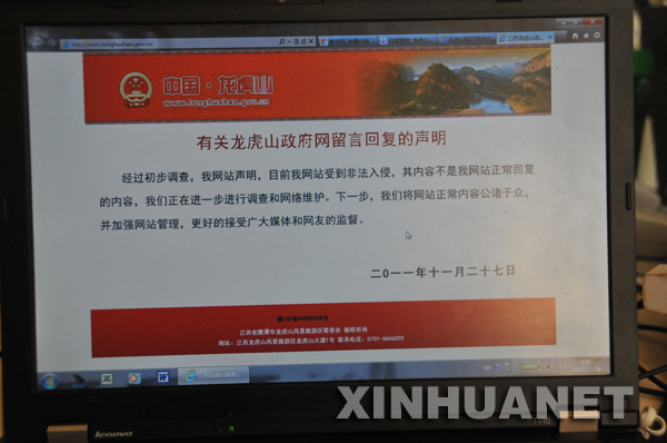 11月27日,龍虎山風景旅游區(qū)管委會發(fā)表聲明稱,網(wǎng)站受到入侵,并非正?;貜蛢?nèi)容。管委會宣傳部長童麗芳對“中國網(wǎng)事”記者表示,“鷹潭市公安局網(wǎng)監(jiān)支隊及市信息中心專業(yè)技術(shù)人員,對政務網(wǎng)相關(guān)后臺數(shù)據(jù)進行了調(diào)查,證實黑客利用程序漏洞進入政務網(wǎng),并對留言回復進行了惡意篡改?!苯刂劣浾甙l(fā)稿,這一事件還在調(diào)查中。