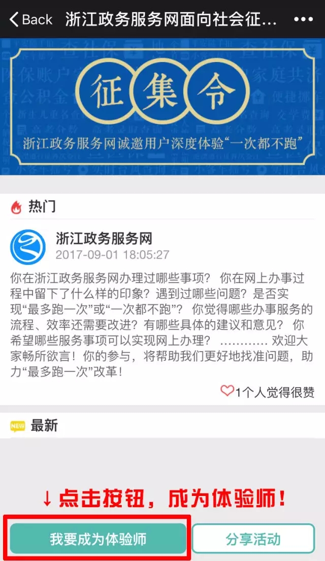 關(guān)注浙江政務(wù)服務(wù)網(wǎng)微信公眾號(zjzwfww),發(fā)送關(guān)鍵詞“體驗”即可進入活動頁面,寫下你的體驗與故事。