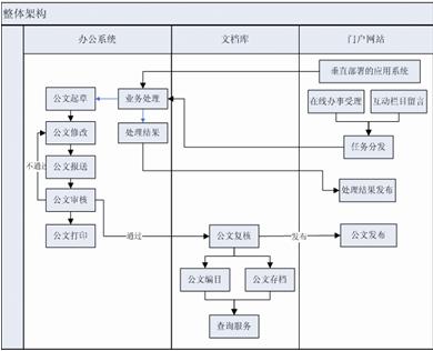 工作人員在辦公系統(tǒng)(OA)中進行日常工作,起草公文或?qū)徟?,通過審批的公文進行歸檔處理,需要發(fā)布的公文進入門戶網(wǎng)站進行發(fā)布;其他的辦公文檔也可依此程序進行歸檔和發(fā)布,打通產(chǎn)生、存檔、發(fā)布之間人為的系統(tǒng)獨立所造成的障礙,從而實現(xiàn)真正意義上的政務(wù)公開,也使得辦公系統(tǒng)中產(chǎn)生的文檔都能被統(tǒng)一保存。