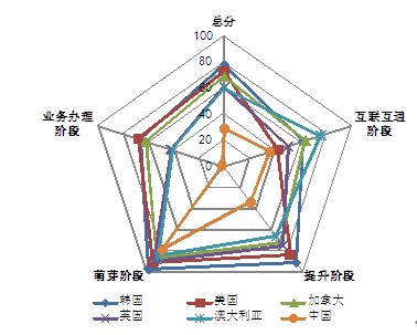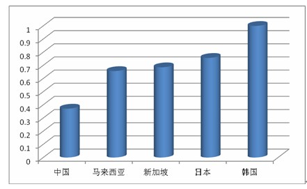 圖1 2010年中國、韓國、日本、新家坡、馬來西亞電子參與度比較