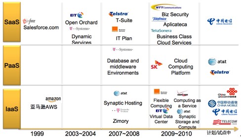 云計(jì)算的一個(gè)典型特征就是IT資源服務(wù)化,也就是將傳統(tǒng)的IT產(chǎn)品、能力通過互聯(lián)網(wǎng)以服務(wù)的形式交付給用戶。那么云計(jì)算主要包含哪些服務(wù)形式呢?通常的分類方法是分為IaaS(Infrastructure as a Service,基礎(chǔ)設(shè)施即服務(wù))、PaaS(Platform as a Service,平臺(tái)即服務(wù))和SaaS(Software as aService,軟件即服務(wù)),基本對(duì)應(yīng)于傳統(tǒng)IT中的硬件、平臺(tái)和應(yīng)用軟件。從下圖2云計(jì)算領(lǐng)域企業(yè)動(dòng)態(tài)可知,目前大多數(shù)運(yùn)營商主要最先從IaaS類服務(wù)進(jìn)軍云計(jì)算。
