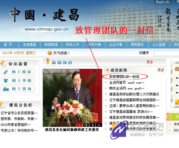 根據(jù)網(wǎng)友提供的線索,記者登陸了建昌縣政府網(wǎng)站,在首頁(yè)建昌新聞欄目中看到,8月3日分別出現(xiàn)了《致管理團(tuán)隊(duì)的一封信》等三篇文章?!吨鹿軋F(tuán)隊(duì)的一封信》一文出現(xiàn)了以下內(nèi)容:
