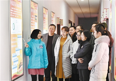 2017年12月27日,在辛集市委宣傳部,工作人員沈艷云(左一)正為參觀者介紹“辛集發(fā)布”政務(wù)微信平臺,分享工作經(jīng)驗(yàn)。 記者霍艷恩攝