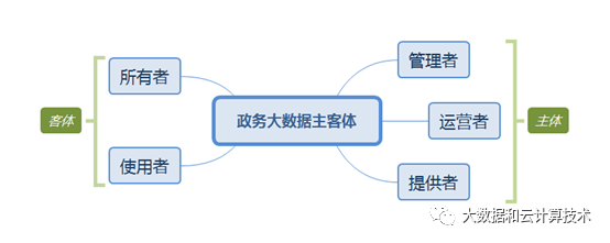 政務(wù)大數(shù)據(jù)的主客體,在類型上可以分為管理者、運(yùn)營者、提供者、所有者和使用者。其中,管理者、運(yùn)營者和提供者是廣義的服務(wù)提供者,是主體;所有者和使用者是廣義的服務(wù)使用者(被服務(wù)對象),是客體。主體和客體都是政務(wù)大數(shù)據(jù)服務(wù)的參與者,它們之間是服務(wù)與被服務(wù)的關(guān)系。在實(shí)際環(huán)境下,同一個(gè)主體或客體,往往具有管理者、運(yùn)營者、提供者、所有者和使用者中兩個(gè)或兩個(gè)以上的多重角色。在本文中,重點(diǎn)從政務(wù)大數(shù)據(jù)服務(wù)的參與者來分析其主客體及相互關(guān)系。