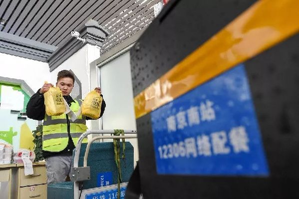 2月7日,在鐵路南京南站12306網(wǎng)絡(luò)配餐中心,送餐員傅秀峰將旅客預(yù)訂的快餐放入配餐盒。 新華社記者李博攝