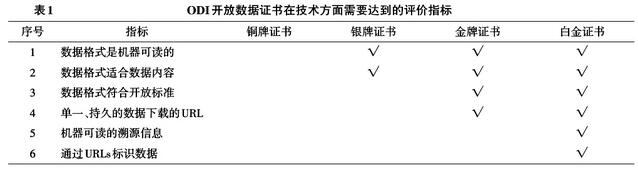 ODM的子項目,英國開放數(shù)據(jù)研究所(Open Data Institute,ODI)開發(fā)和維護的在線工具“開放數(shù)據(jù)證書”(certificates.theodi.org),則是通過收集每個數(shù)據(jù)集的DCAT(Data Catalog Vocabulary)元數(shù)據(jù)評價其質(zhì)量和可信度,評價結(jié)果從低到高分為四類證書:銅牌、銀牌、金牌和白金證書。項目考察開放數(shù)據(jù)集的法律、技術、社會和實踐四個方面的23個指標,“機器可讀的溯源信息”是技術方面的6個指標之一,見表1。級別越高要求達到的指標越多,“溯源”是最高級別的“白金證書”所必需的。