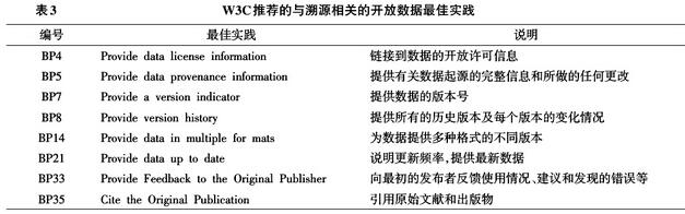 2016年8月30日,DWBP工作組的主要成果——在Web中發(fā)布數(shù)據(jù)的最佳實踐,成為W3C的候選標準[15]。工作組為開放數(shù)據(jù)推薦了35個最佳實踐(Best Practice,BP),其中19個有助于提升數(shù)據(jù)的可信度,而與溯源相關的最佳實踐有8個,見表3。