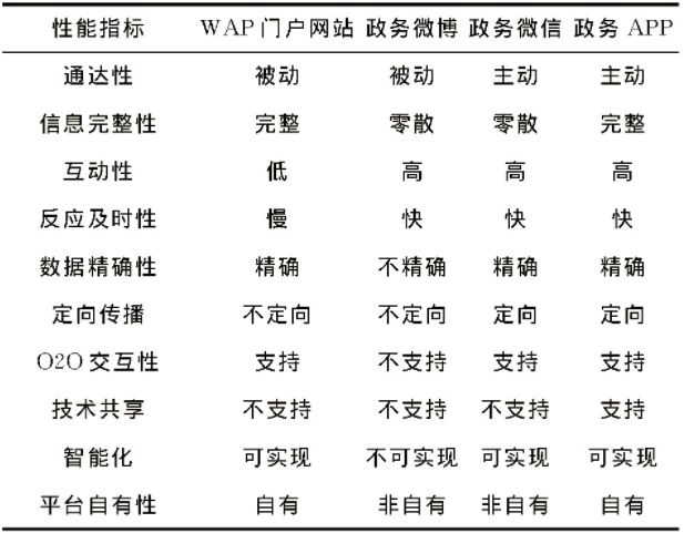 綜合學界對于移動政務平臺研究的學術觀點,結合費軍等人政務平臺實用性研究成果,以WAP門戶網(wǎng)站、政務微博、政務微信、政務APP為代表來對比分析各政務平臺的性能特點。我們綜合選取了10種共3類性能指標,即基本服務功能要求指標(通達性、信息完整性、互動性、反應及時性)、智能化服務性能指標(數(shù)據(jù)精確性、定向傳播、O2O交互性)、擴展服務性能指標(技術共享、智能化、平臺自有性)來進行對比,以此展示各移動政務平臺的性能(見表1)。