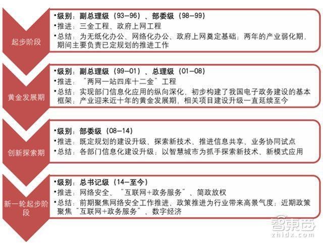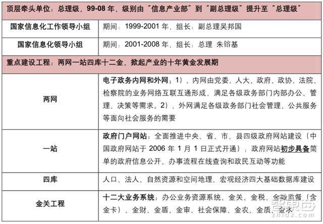▲電子政務(wù)黃金發(fā)展期:牽頭單位、重點(diǎn)項(xiàng)目(兩網(wǎng)一站四庫(kù)十二金)