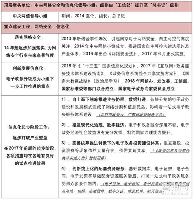 另一方面,頂層牽頭機(jī)構(gòu)的級(jí)別層次,決定了電子政務(wù)建設(shè)實(shí)施的落地進(jìn)程。2014 年至今,在中央網(wǎng)絡(luò)安全和信息化領(lǐng)導(dǎo)小組的推進(jìn)下,電子政務(wù)行業(yè)已經(jīng)來(lái)到了新一輪的起步階段。