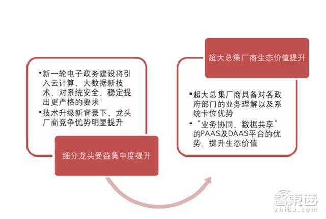 “大平臺(tái)、大數(shù)據(jù)、大系統(tǒng)”的頂層架構(gòu)將塑造新的產(chǎn)業(yè)生態(tài),從過(guò)去的產(chǎn)業(yè)鏈垂直的分工升級(jí)至生態(tài)共同體;超大型總集廠商具備對(duì)各政府部門(mén)的業(yè)務(wù)理解以及系統(tǒng)卡位優(yōu)勢(shì),在“互聯(lián)網(wǎng)+政務(wù)服務(wù)”成功轉(zhuǎn)型的情況下,其將在政務(wù)云/數(shù)據(jù)互聯(lián)互通時(shí)代下,具備更強(qiáng)“業(yè)務(wù)協(xié)同、數(shù)據(jù)共享”的PAAS及DAAS平臺(tái)型的優(yōu)勢(shì);成為產(chǎn)業(yè)生態(tài)體系中的重要支撐,其產(chǎn)業(yè)價(jià)值將遠(yuǎn)高于過(guò)去的傳統(tǒng)集成總包。