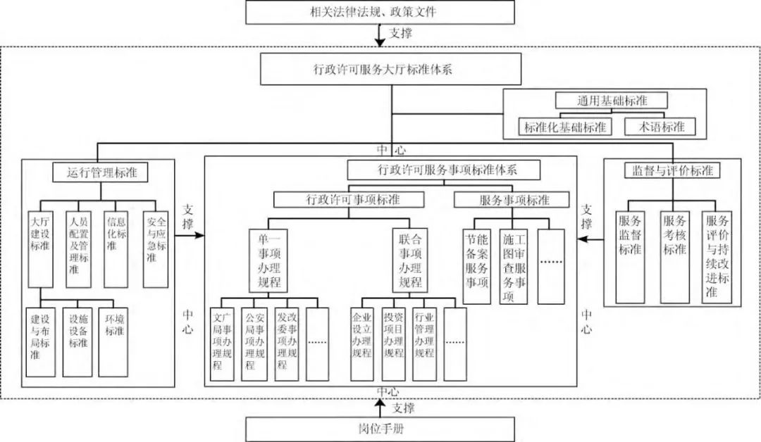 建設(shè)一套合適的政府服務(wù)標(biāo)準(zhǔn)體系是解決目前行政許可服務(wù)中心問(wèn)題推進(jìn)標(biāo)準(zhǔn)化工作的關(guān)鍵所在。借鑒國(guó)家、地方行政標(biāo)準(zhǔn)體系建設(shè)的經(jīng)驗(yàn)以及深入了解行政服務(wù)中心標(biāo)準(zhǔn)化的實(shí)際需求, 與時(shí)俱進(jìn), 探索建立以下模式來(lái)完善政府服務(wù)標(biāo)準(zhǔn)體系 (見(jiàn)圖1) 。