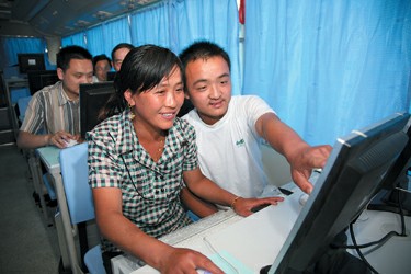 信息大篷車上,農(nóng)村學(xué)員興致勃勃地學(xué)習(xí)上網(wǎng)。 王萬(wàn)隆