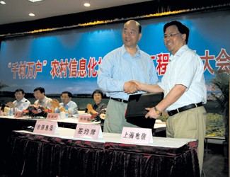 上海市信息委主任傅文彪(左)與中國(guó)電信上海公司總經(jīng)理張維華簽署“千村萬(wàn)戶”農(nóng)村信息化培訓(xùn)協(xié)議。 王萬(wàn)隆