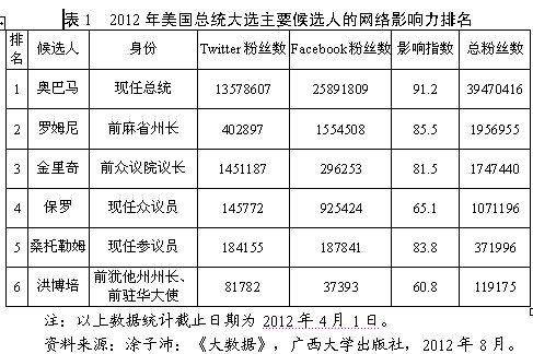2006年《時(shí)代》雜志把年度風(fēng)云人物授予“所有網(wǎng)民”,認(rèn)為網(wǎng)絡(luò)已發(fā)生了從公共機(jī)構(gòu)或組織向個(gè)人——即該雜志所提出的新數(shù)字民主主義公民的轉(zhuǎn)變,這也標(biāo)志著網(wǎng)民作為一支重要的政治力量被大家開始關(guān)注和重視。美國總統(tǒng)奧巴馬更是善用微博,是各國首腦中的微博“人氣王”,而2012年的美國總統(tǒng)大選結(jié)果更是各候選人在微博上的影響力的真實(shí)反映,具體如表1所示。