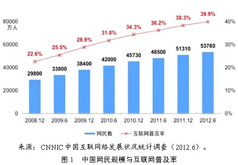 根據(jù)中國互聯(lián)網(wǎng)信息中心(CNNIC)發(fā)布的《第30次中國互聯(lián)網(wǎng)絡(luò)發(fā)展?fàn)顩r調(diào)查統(tǒng)計(jì)報(bào)告》顯示,截至2012年6月底,中國網(wǎng)民數(shù)量達(dá)到5.38億,互聯(lián)網(wǎng)普及率為39.9%,從人數(shù)規(guī)模上具有了很強(qiáng)的代表性。具體見圖1。