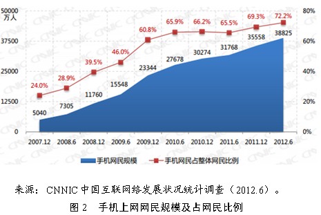 其中,我國的手機(jī)網(wǎng)民規(guī)模達(dá)到3.88億,網(wǎng)民中用手機(jī)接入互聯(lián)網(wǎng)的用戶占比由上年底的69.3%提升至72.2%。具體見圖2。
