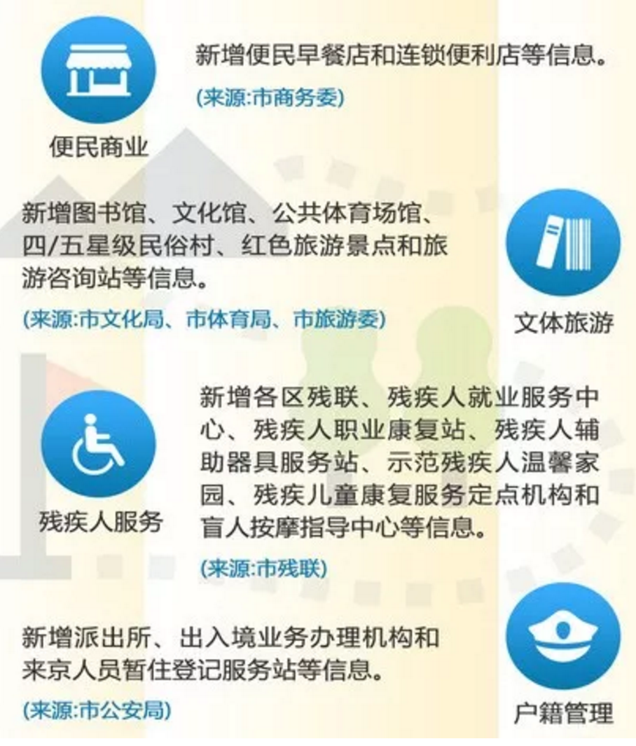 據(jù)介紹,新增的公開地圖內(nèi)容涉及教育資源、醫(yī)療衛(wèi)生機構(gòu)、社會保障服務(wù)、民政事務(wù)、便民商業(yè)網(wǎng)點、文體旅游、殘疾人服務(wù)、戶籍管理、交通管理等12類57幅,實現(xiàn)了862所公辦幼兒園、435家免疫規(guī)劃預防接種門診、1366個便民早餐店、470個殘疾人職業(yè)康復站、3064個來京人員暫住登記服務(wù)站、115個司法鑒定機構(gòu)、200個工商機構(gòu)等服務(wù)信息一站查詢、一覽無余。