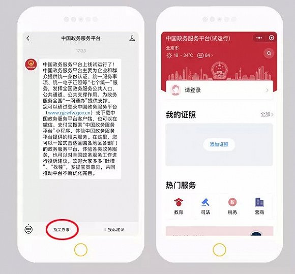 方法5:在微信里關(guān)注“中國政務(wù)服務(wù)平臺(tái)”服務(wù)號(hào),點(diǎn)擊底部菜單欄“指尖辦事”,進(jìn)入“中國政務(wù)服務(wù)平臺(tái)”小程序