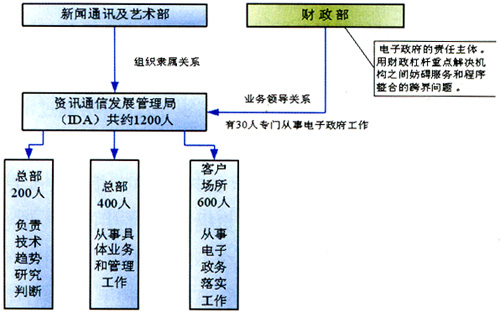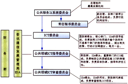新加坡是一個680平方公里的島國,自然資源較為匱乏,90%食品和50%飲用水靠進(jìn)口。為保持國家較強(qiáng)的競爭優(yōu)勢,該國政府注重利用信息化進(jìn)一步提升政府的管理服務(wù)能力,從而成為全世界最早推行“政府信息化”并取得顯著成效的國家之一。1999年12月1日,以調(diào)整成立新加坡資訊通信發(fā)展管理局(以下簡稱IDA,職能類似我們的信息化委員會)為標(biāo)志,構(gòu)建立起了一套獨(dú)具特色的信息化應(yīng)用推進(jìn)治理體系。(詳見下圖)