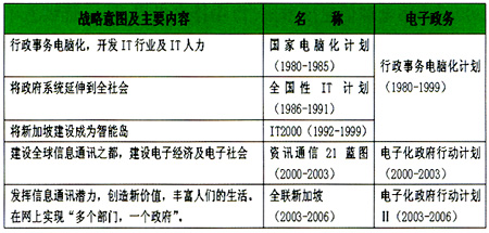 新加坡非常注重構(gòu)畫共同認(rèn)可的信息化發(fā)展遠(yuǎn)景,引導(dǎo)發(fā)展方向,體現(xiàn)戰(zhàn)略意圖。IDA負(fù)責(zé)電子政務(wù)的吳彩賓副局長在談到成功經(jīng)驗時說,在跨部門協(xié)調(diào)中,首先是確定共同的實現(xiàn)目標(biāo),圍繞著共同目標(biāo)再商量具體實施的方式方法,阻力會比較小。新加坡先后推出了五個全國性ICT策略計劃和三個電子政府計劃。(詳見下圖)