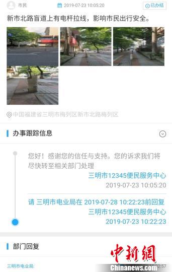 在三明市便民服務(wù)收到的眾多訴求件中,一條“點(diǎn)贊”信息引起記者的注意。一位市民寫道:“e三明”功能還是挺強(qiáng)大的,前天看到的訴求案件,今天就處理清楚了。供電公司響應(yīng)的速度也很快,才兩天時(shí)間,不僅把這條盲道上的拉線拆除了,還把旁邊的電桿也拆除了,點(diǎn)贊!