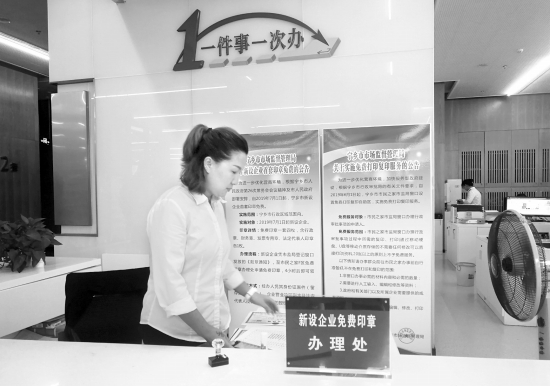 8月28日,寧鄉(xiāng)市市民之家,工作人員在新設(shè)企業(yè)免費(fèi)印章辦理處忙碌。從今年7月1日起,寧鄉(xiāng)市實(shí)行新設(shè)企業(yè)首套印章免費(fèi)制度。圖/王嬌嬌