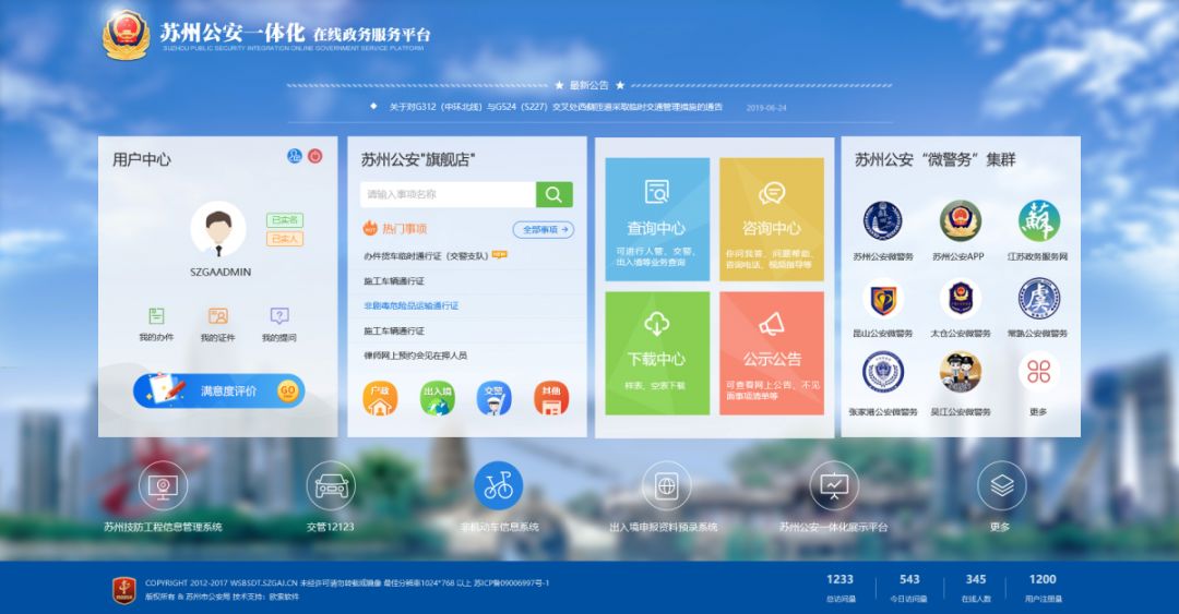 9月23日,蘇州公安“一體化在線政務(wù)服務(wù)平臺(tái)”(以下簡(jiǎn)稱“一體化平臺(tái)”)正式上線啦!這是蘇州市公安局按照省廳總體部署,歷時(shí)近6個(gè)月的開發(fā)建成的全新平臺(tái),是全省地級(jí)市中第一個(gè)上線的“一體化平臺(tái)”,將為大家提供更便捷、更智能、更安全的公安在線政務(wù)服務(wù)。