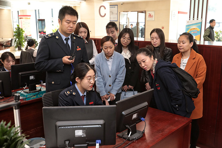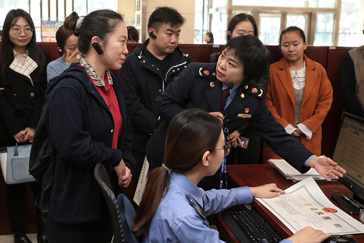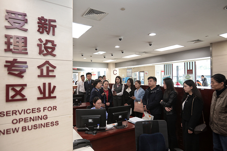 群眾代表在工作人員的帶領(lǐng)下,觀(guān)看營(yíng)業(yè)執(zhí)照的申領(lǐng)流程。