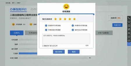 根據(jù)設(shè)計,“好差評”的評價等級分為五個,即分為非常滿意、滿意、基本滿意、不滿意、非常不滿意。評價采取實(shí)名制,辦事企業(yè)和群眾每辦理一次政務(wù)服務(wù)事項(xiàng),都可以在辦理完畢后評價一次。