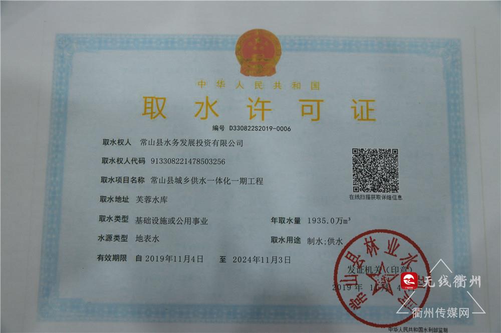 今天,常山縣水務(wù)發(fā)展投資有限公司在衢州市行政服務(wù)中心領(lǐng)取了取水許可電子證照。這可是全國(guó)首張取水許可電子證照哦~