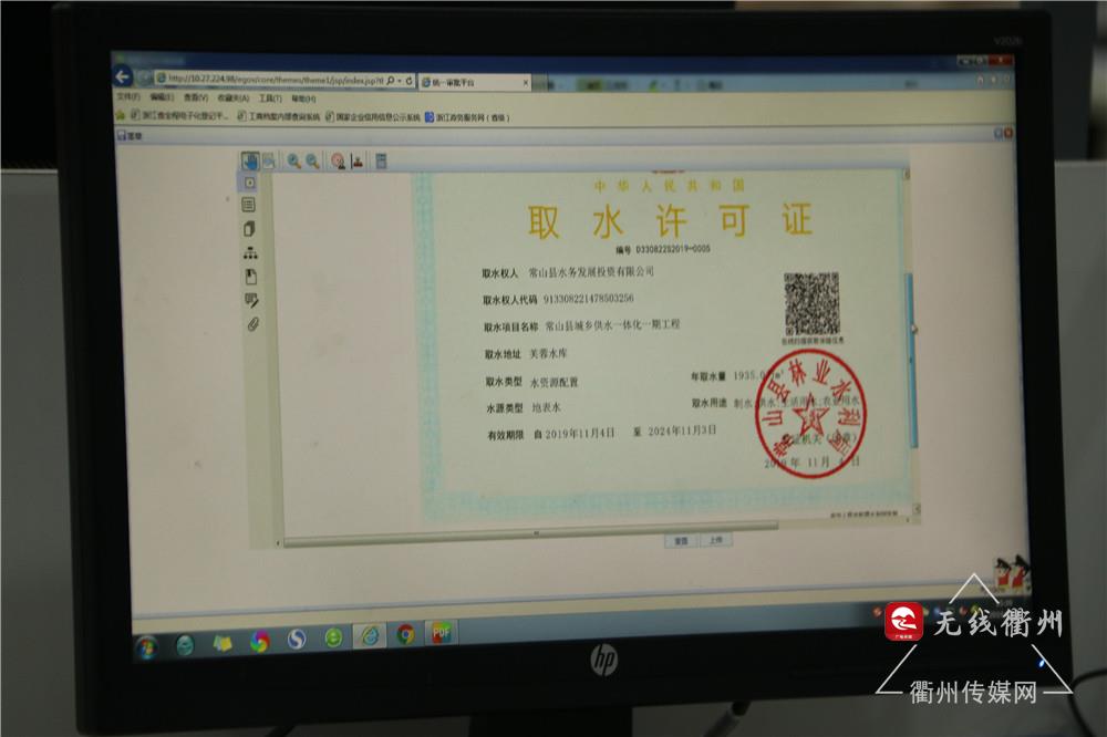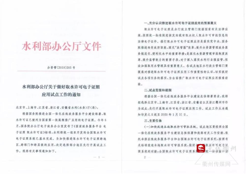 今年9月份,衢州與北京市、上海市、江蘇省、浙江省、安徽省一起被水利部列入全國(guó)取水許可電子證照試點(diǎn),是全國(guó)六個(gè)試點(diǎn)中的唯一地級(jí)市。
