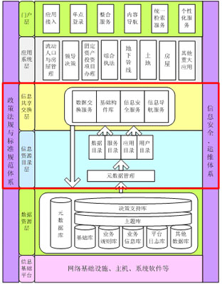 電子政務(wù)總體技術(shù)框架如圖所示,包括了信息基礎(chǔ)平臺層、數(shù)據(jù)資源層、信息資源目錄層、信息資源共享交換層、應(yīng)用系統(tǒng)層和門戶層等多個層次,以及信息安全、政策法規(guī)與標(biāo)準(zhǔn)規(guī)范兩大保障體系。
